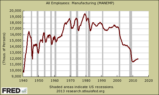 The St Louis Fed chart severely understates the collapse of American industrial employment by failing to adjust for population growth. When you take into account population, which grew from 132M in 1940 to 332M in 2020 you can see that industrial employment actually peaked in 1980 at 10 percent of the population. This had collapsed to fewer than 4 percent of the population as of 2012. Of course that drop can be extrapolated further, as we are now well over a decade past the period shown on the graph. It’s in free-fall and we can see the wreckage sleeping in cars or under bridges every day.