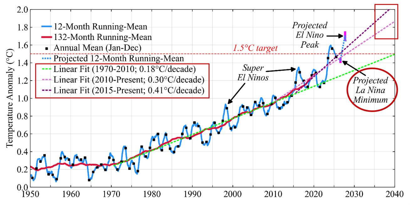 Two years ago, when many doubted the reality of global warming acceleration, we noted that the peak of the ongoing El Nino and the following La Nina valley could help confirm the reality of acceleration and assess whether average global temperature has already reached 1.5°C. The La Nina valley is yet to be determined, as the 12-month mean is still declining. We projected a minimum of 1.4°C to be achieved by the second quarter of 2026. A minimum about 1.4°C will be strong support of global temperature acceleration, as such La Nina minimum is higher than any El Nino maximum in the prior decade, which included a “Super El Nino.” In turn, it supports the mechanisms that we suggest are behind acceleration: high climate sensitivity (at least 4°C for doubled CO2) and reduction of aerosol cooling due to declining aerosol emissions from East Asia and ships at sea (Global warming in the pipeline, and Global warming has accelerated).