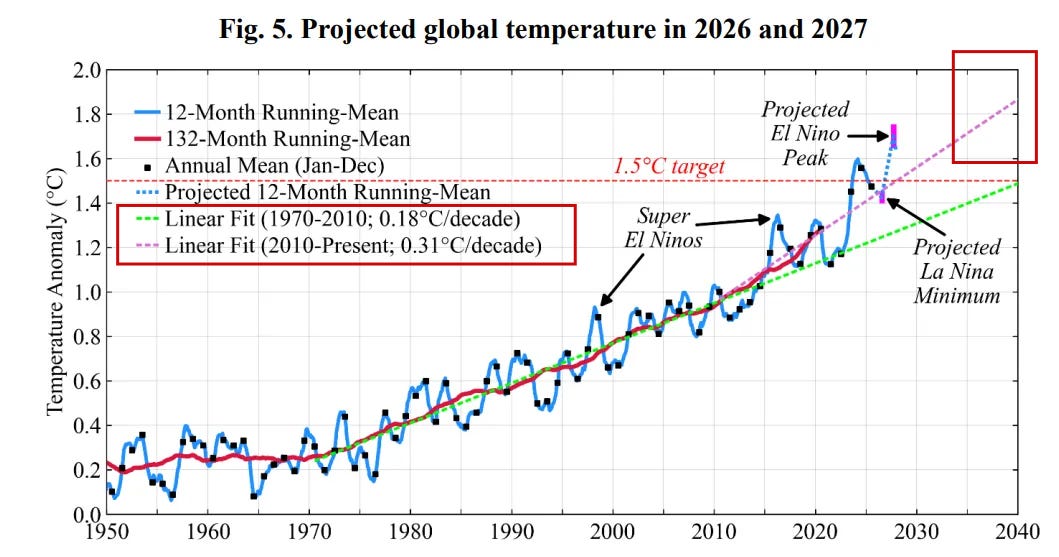 Last December we featured a piece, “Near-Term Climate News and Other Tall Tales,” which included the following chart. The source is James Hansen’s December 2025 climate letter, available here. I’ve highlighted in red two areas of special interest.