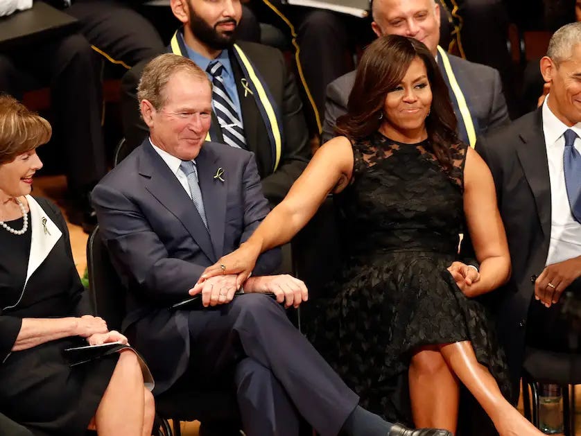 Trump is the perp at the top, not Bush, Obama or Biden. Each of the others were in favor with mainstream elites — party, politicians, media, makers of public opinion. George Bush, torturer, killer, is especially loved.
