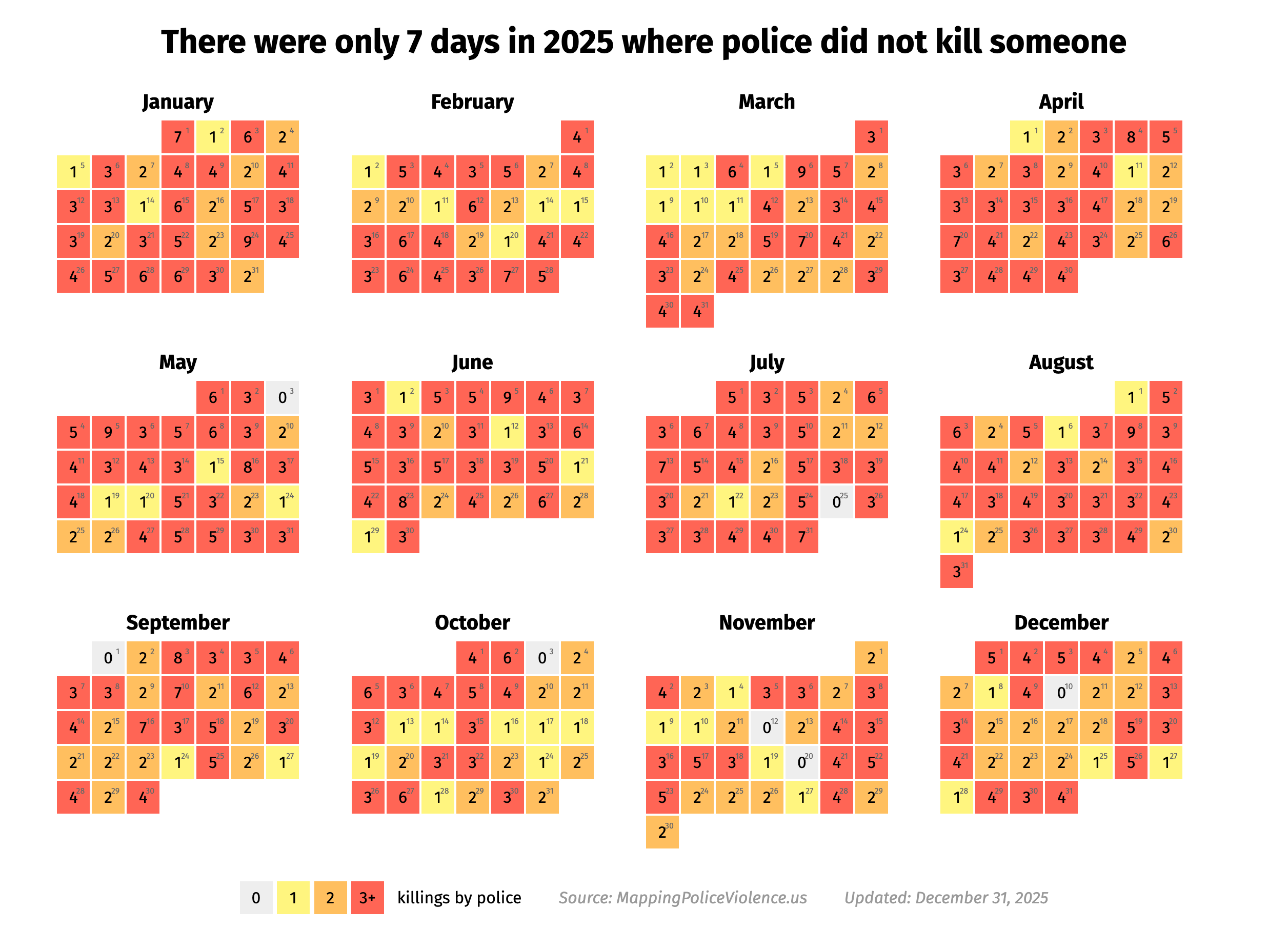 From 2013 through 2026, it’s a straight-line graph through the year — death strikes like a clock, tik-tok, and the rate never slows.