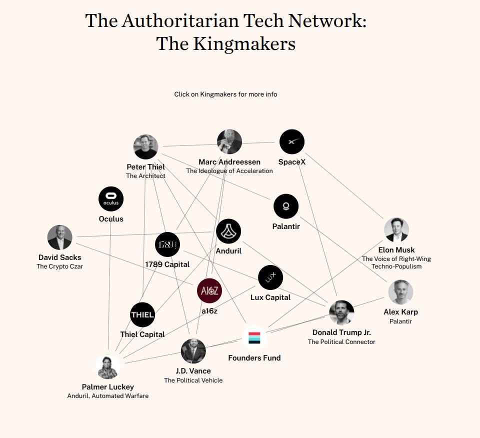 Right now, the Tech Overlords have a considerable lead. Like the rest, they want total control — so much that they’re not even lip service–fans of democracy. “I no longer believe that freedom and democracy are compatible,” says billionaire Peter Thiel. They desperately want an intrusive, unchallenged, domestic security state.